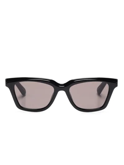 black tinted lenses sculpted arms curved tips These glasses come with a protective case.