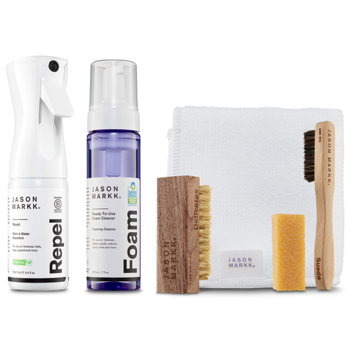Keep your sneakers squeaky clean with the Jason Markk Premium Bundle. A thoughtful curation of trusted favorites, this premium bundle helps clean, condition, and protect your shoes from dirt and stains. Whether you're going for brunch with family or hanging out with your friends, make sure your sneakers look as good as you do with the Jason Markk Premium Bundle. Jason Markk Premium Bundle features: Ready-to-use Foam and a Premium Cleaning Brush provide a powerful clean that's gentle enough for delicates. Suede Cleaning Kit cleans up and revives materials like suede and nubuck. Extremely absorbent and quick-drying Premium Microfiber Towel wipes clean any remaining stain. Repel Spray (to be used after cleaning) protects from spills, stains, rain, or shine.