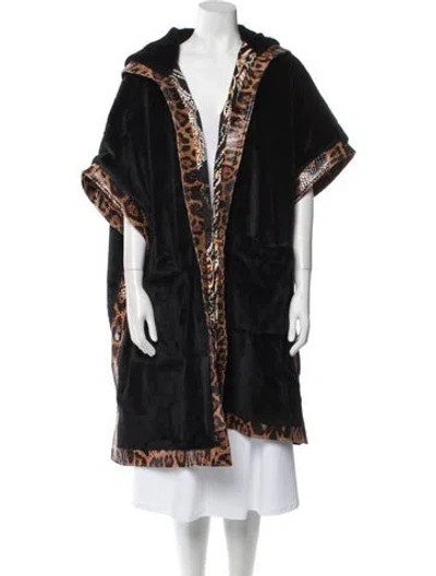 Jayley Collection Coat Black Printed With Hood Leather Trim Embellishment & Shawl Collar Knee-Length Patch Pockets & Open Front | Jayley Collection Printed Coat in Black
