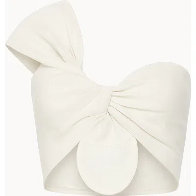 JBQ "Sol" top accented with a statementmaking front twist detail Approx. 15"L from shoulder to hem Oneshoulder neckline Sleeveless Fitted Cropped hem Back zipper closure Linen/viscose/spandex Made in USA