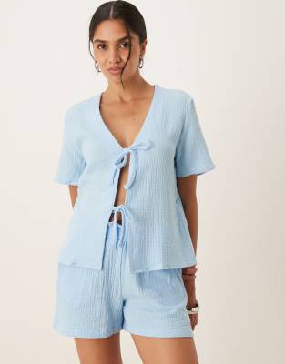 Short Sleeve Tie Front Cheesecloth Shirt In Blue