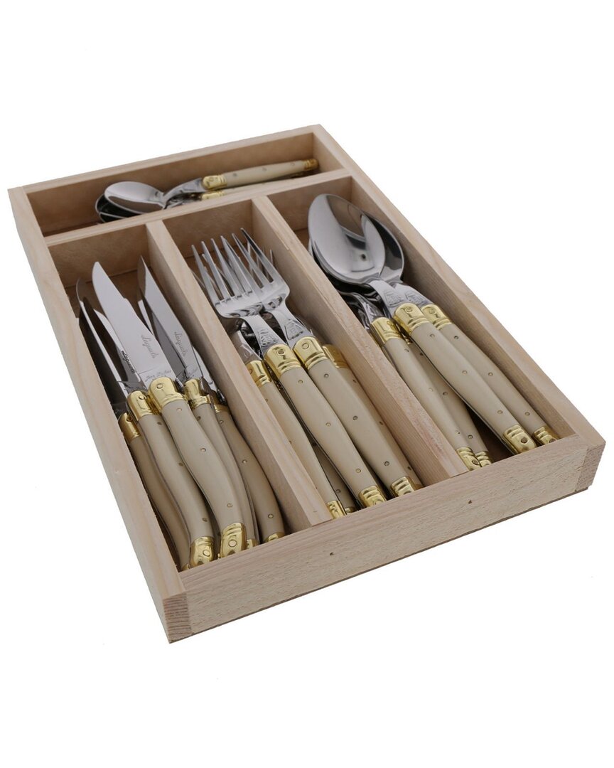About The Brand: Cutting-Edge French Knives For All Your Kitchen Needs. Color/Finish: Ivory / Brass Materials: Stainless Steel / Abs Handles Food Safe Hand Wash Made In France Contents Of Set: 6 Forks 6 Knives 6 Dessert Spoons 6 Soup Spoons