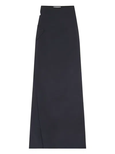 Covered front closure Long wrap-front skirt-style panel with button closure Back buttoned welt pocket Straight leg Blue color 77% Polyester, 23% Virgin Wool Made in Italy