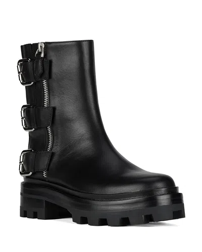 Polished zip and buckle hardware shine against the smooth leather upper of a streetwear-inspired boot grounded by a lugged sole for enhanced traction and durability. 2" heel; 1" platform; 1" slope 7" shaft Side zip closure Leather upper and lining/synthetic sole Imported