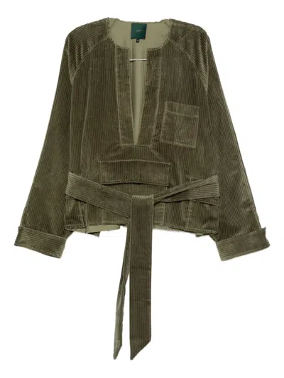 green corduroy texture v-neck chest patch pocket tie detail buttoned cuffs