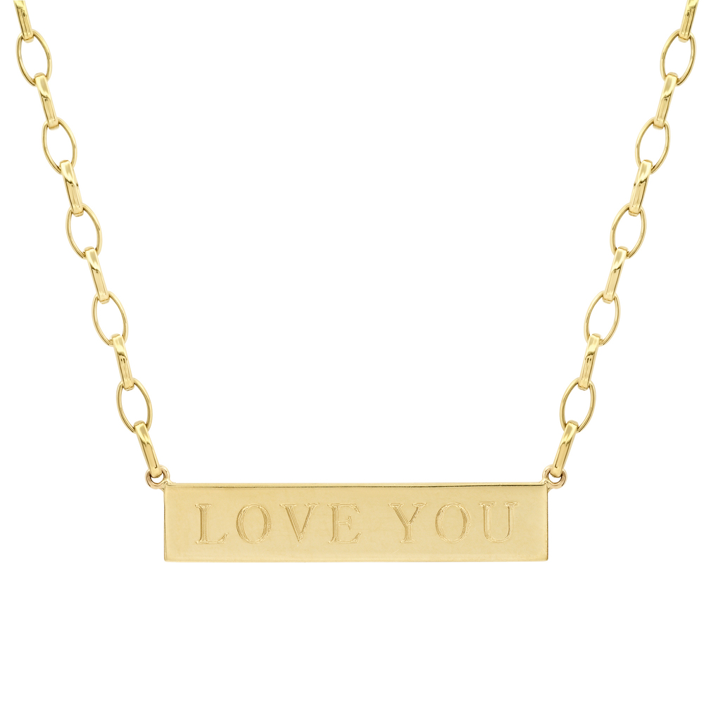 Jennifer Meyer Edith Link Nameplate Necklace in 18K Yellow Gold: Set on a 16-inch chain, this sweet and simple nameplate necklace is engraved with the words “LOVE YOU,” making it a great gift for your mom, your sister, your best friend, or anyone else that lights up your life.18k gold Chain: 16"; Nameplate: 1" x 0.25" Made in USA.