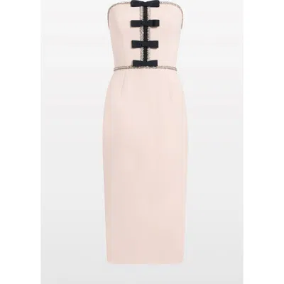 A striking cocktail dress defined by its sculpted silhouette and graphic detailing. The strapless bodice is accentuated with a row of satin bows and sparkling embellishment that traces the neckline and waist. Elegant and bold in equal measure, its a refined choice for evening events or formal celebrations. MISSING BULLETS