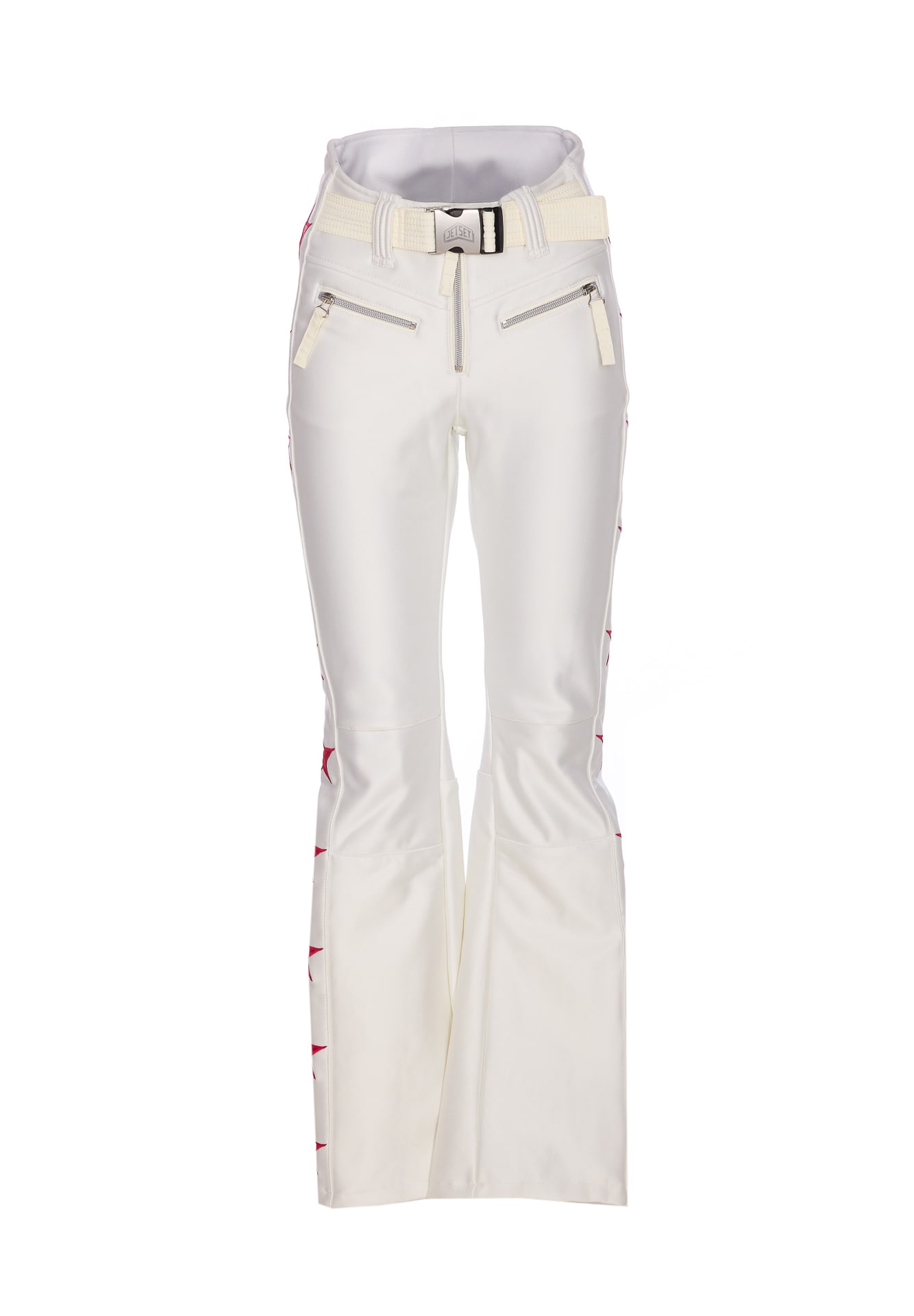 Jet Set white Tiby ski pants, high waist, patch logo on the back, zip closure, belt on waist, lateral band with embroidered stars details, zip details Composition: 43% Polyamide, 43% Polyester, 14% Elastane, 67% Polyester, 13% Elastane, 100% Polyester