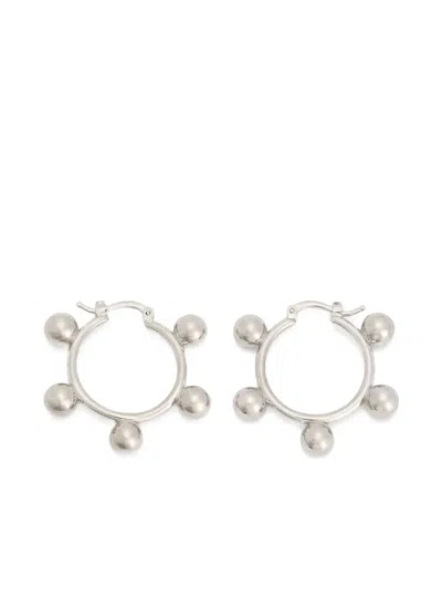 silver brass construction hoop design five bead embellishments snap-post closure engraved logo These earrings come as a pair.