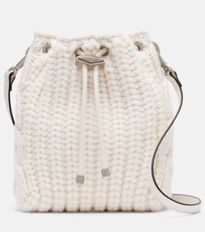 Jimmy Choo wool knitted bucket bag100% wool; trim 100% leatherDrawstring fasteningKnitted wool texture, drawstring closure, detachable shoulder strap, one main compartment, silver-toned hardwareHeight 19cm, length 14cm, depth 3cmWipe with a clean, dry clothMade in Italy