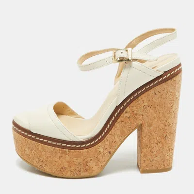 Pre-owned Cream Leather Wedge Cork Platform Sandals Size 37