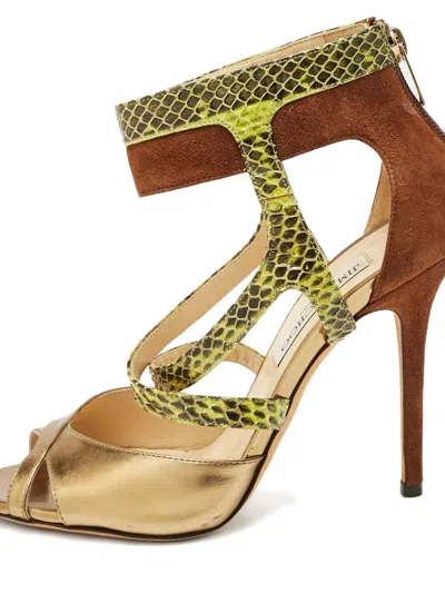 yellow python embossed leather brown suede gold leather cutout design ankle strap Condition: GOOD. This previously owned and used item is in good condition with minimal signs of use. This may include fading of material or plating and scratches.