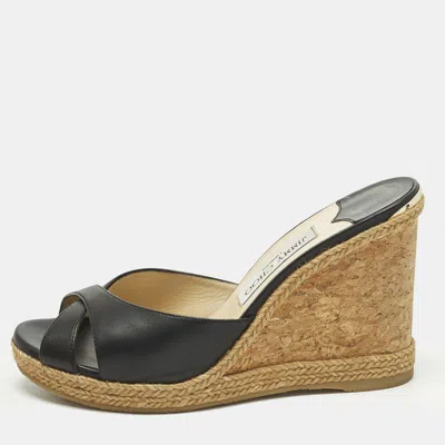 Pre-owned Size 40 Black Leather Platform Wedge Slide Sandals