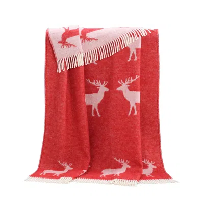 A vibrant throw that will add a burst of colour to your home all year round. Woven from 100% wool, this cosy throw has a design of majestic deer and is finished off with a fringed edging in a neutral off-white. The throw has the inverted colours on the reverse and can be used to best suit your mood. The touch of warmth that any home needs this winter. Happy living with friendly designs! J. J. Textile deals in exclusive woollen and cotton textile products, designed with love and passion by Jurate Jakstaite. Reversible Throw Colour- Red/Off-White Wool Product Care All wool is washable, you just need to know how to handle it properly to keep its softness and longevity. How we dry a washed wool product is also very important. Do not wash your wool unless absolutely necessary. Like all soft furnishing products, wool loves fresh air and a light breeze so if you think your wool product needs freshening up, try hanging it outside for a few hours on a nice day but keep it out of strong sunlight. Cold Machine-Washing Wool When washing a wool product in an automatic washing machine please use the delicate programmes – cold wash, wool wash, hand wash, no more than 30 degrees – and wash on its own (1 throw per wash), not with any other items. Please do not use a powder detergent, just liquid. You could also use special wool fabric softeners, but only a very small amount and rinse your throw thoroughly afterwards as leaving some of the softener in the item could cause stains, unpleasant odour or provoke allergies. Cold Hand Washing Wool For smaller items like little blankets and cushion covers you may want to wash them by hand. Fill a bathtub or large bucket with lukewarm water, add some mild soap suitable for washing wool and leave your wool item to soak for about an hour. After it has soaked gently rub any soiled parts using another part of the throw or cushion cover. When it has been washed all over drain the water then refill with clean water and leave to soak for another 15 minutes – you can repeat this several times until you are happy all of the soap has been washed out. Then follow the recommendations below for drying. Do Not Bleach Wool Please do not bleach a wool product as it will destroy the wool fibre and will spoil your woollen item. Drying Wool Do not tumble dry your wool product. Instead we advise you to lay it flat to dry. When you take the item out of the machine, or have finished hand washing, it will be quite wet so gently squeeze out any excess water (do not wring!). Lay it down on top of a cotton towel on a flat surface, smoothing out any wrinkles (if it is a large item then fold it carefully to a quarter of the size). It is essential that the item is placed on top of an absorbent material, such as a towel, as the moisture from the wool will be absorbed downwards. Change the towel underneath regularly until the wool is completely dry (if the weather is nice this can be done outside but remember to keep it out of direct sunlight). Do not shake or hang a wet wool product as this could cause damage. Ironing Wool You can gently iron a wool product using the steam settings on your iron. Do not press too hard, to keep the softness, and use a mid to low heat setting. Dry Cleaning Wool If you are not confident to wash wool yourself then we advise you to use a dry-cleaning service. By following these recommendations, you can enjoy the lasting quality of wool for many years to come! Wool 100% Wool 100%