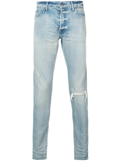 Light blue cotton blend distressed acid wash jeans from John Elliott featuring a mid rise, a waistband with belt loops, a button and zip fly, a five pocket design, an acid wash, a distressed finish, ripped details, a straight leg and a regular length.