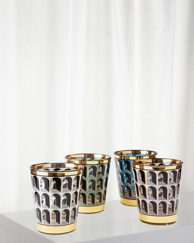 Elevate your cocktail hour or table setting with the Jonathan Adler Set of 4 Boxed Arcade Glassware. Inspired by the storied arches of the Colosseum, this stunning glassware reimagines an iconic architectural motif in moody curves and colors. Each piece features gold accents and a bold design that is sure to impress your guests.Packaged in a couture gift box, this four-piece set is the perfect housewarming or hostess gift. Or, keep them for yourself and add a touch of luxury to your own home. Each glass measures 3.75 inches by 4 inches and has a capacity of 11.75 fluid ounces.These glassware pieces arrive ready to use and are made in the USA. Hand wash with mild soap and water only, and dry metallic accents and finishes immediately to avoid watermarks. Please note that these glasses are not microwave safe.Add a touch of glamour to your home decor with the Jonathan Adler Set of 4 Boxed Arcade Glassware.