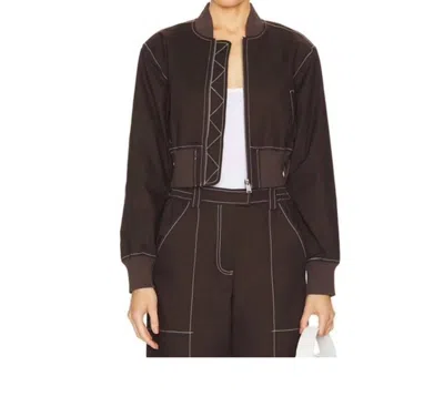 A riff on your favorite classic bomber jacket.features cropped silhouetteFront zipper closuredark brown with white stitching trimribbing at collar and hemShell - 98% Cotton 2% Spandex, Combo - 83% Recycled Viscose 17% PolyesterMatches the pants that are in a different listing