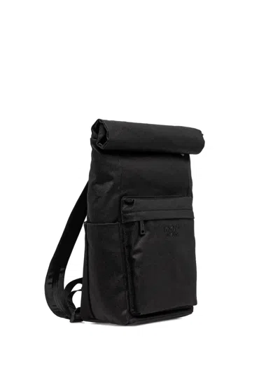 black roll-top closure external pocket adjustable straps padded back panel logo plaque
