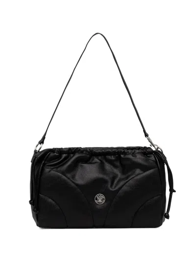 black quilted design logo plaque drawstring fastening top handle silver-tone hardware