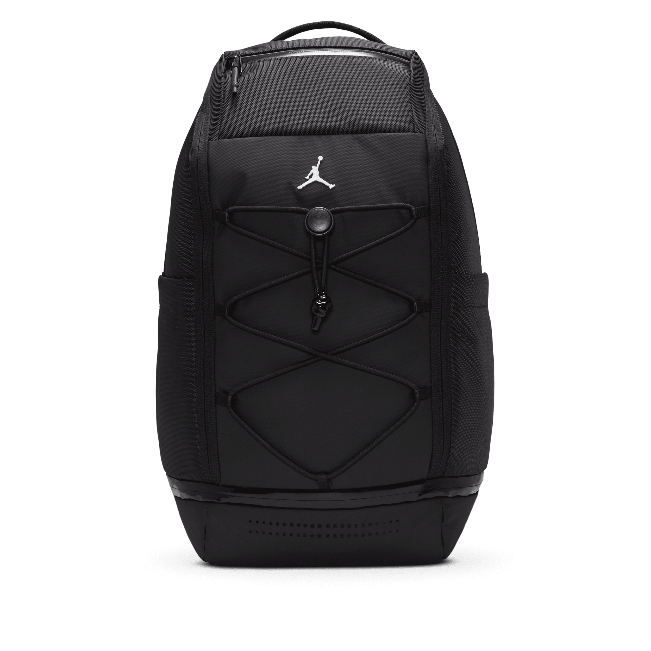 Carry your stuff in DNA style with this spacious Jordan backpack. The spacious main zippered compartment can hold books, a change of clothes or whatever else you need. The zippered compartment on the back is padded to help secure a laptop or tablet. Keep up with hydration by using the side bottle pockets, the laced bungee cord on the front can be used to hold something extra and the adjustable padded straps provide comfortable wear. What really puts this backpack over the top are the organizational pockets and the ventilated shoe garage at the bottom! Product Details:20.5"H x 12.5"L x 8"D; Strap Length: 38" (longest), 19" (shortest). 100% Polyester. Spot Clean. Imported. Style: MA0945; Color: Black; Size: One Size; Gender: Male; Age Group: Adult | Jordan Sport Backpack (32.9L) in Black, Size: One Size | MA0945-023