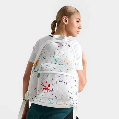 Large main compartment with dual-zipper closure Smaller zippered front compartment Padded shoulder straps Top haul loop Metallic details Number 23 allover print100% polyester body, 100% polyurethane handles and trim Dimensions: 16"H x 12.5"L x 6"D; Handle Drop: 3"; Strap Length: 34" (longest); 17" (shortest) The Jordan Monogram Backpack is imported. Carry your stuff in undeniable Jordan style with the Jordan Monogram Backpack. It's covered in the number 23 and features bold metallic details that give it a premium feel. Jordan Monogram Backpack in White/Paint Splatter