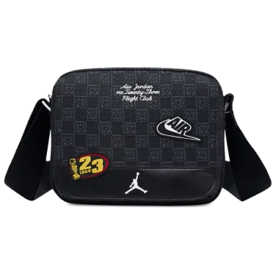 Carry your stuff like a baller with this fashionable messenger, constructed in a convenient smaller size you can take almost anywhere. It's made of durable fabric finished with an allover woven monogram pattern and has a zippered main compartment to help secure your belongings. The front flap features patch detailing a faux leather panel as well as hidden magnetized closures for a more personalized look. Benefits:The main compartment has an inner slip pocket to hold your cards and other smaller items you want easy access to. The strap is adjustable for comfortable wear. [] Product Details:7\H x 9\L x 3.5\D. Strap Length:60\ (longest), 30\ (shortest). Main Body:100% polyurethane. Lining:100% polyester. Spot Clean. Imported. Style: MA9156; Color: Black; Size: One Size; Gender: Male; Age Group: Adult | Jordan Monogram Messenger Bag (3.6L) in Black, Size: One Size | MA9156-023