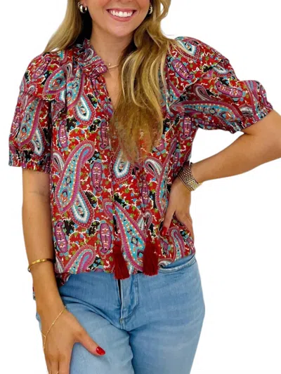 A versatile blouse that works from desk to dinner!Elevate your spring wardrobe with the Camila Flutter Sleeves Top by Joy Joy, a vacation-ready piece in vibrant red. This women's blouse features short flutter sleeves, a collar neckline, and a playful paisley print. Crafted from 100% polyester, it boasts a pull-on closure for easy wear. Model is wearing a size small.