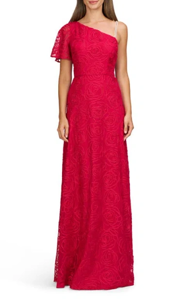 This floor-sweeping gown features tonal blooms that bring an air of romance to your look making it perfect for a gala or a wedding. 60 1/2" length Hidden side-zip closure Asymmetric neck Single short sleeve Lined 100% polyester Dry clean Imported