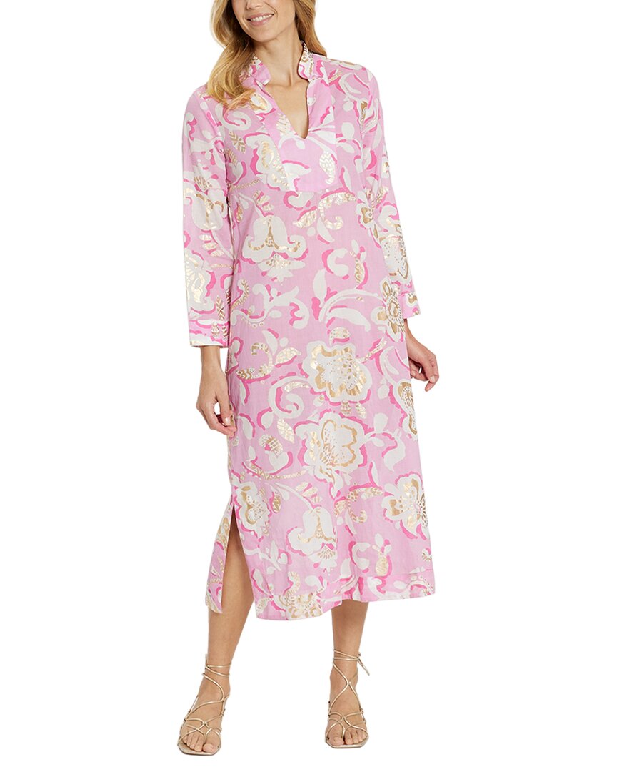 Introducing the Jude Connally Lyra Maxi Dress in Grand Floral Pink Gold. This stunning dress features a V neckline, long sleeves, and is approximately 48.5 inches from shoulder to hem. Made from 100% cotton, this dress is lined for added comfort. Easy to care for, simply machine wash and cool iron if necessary. Imported and perfect for any occasion, this dress is a must-have addition to any wardrobe.