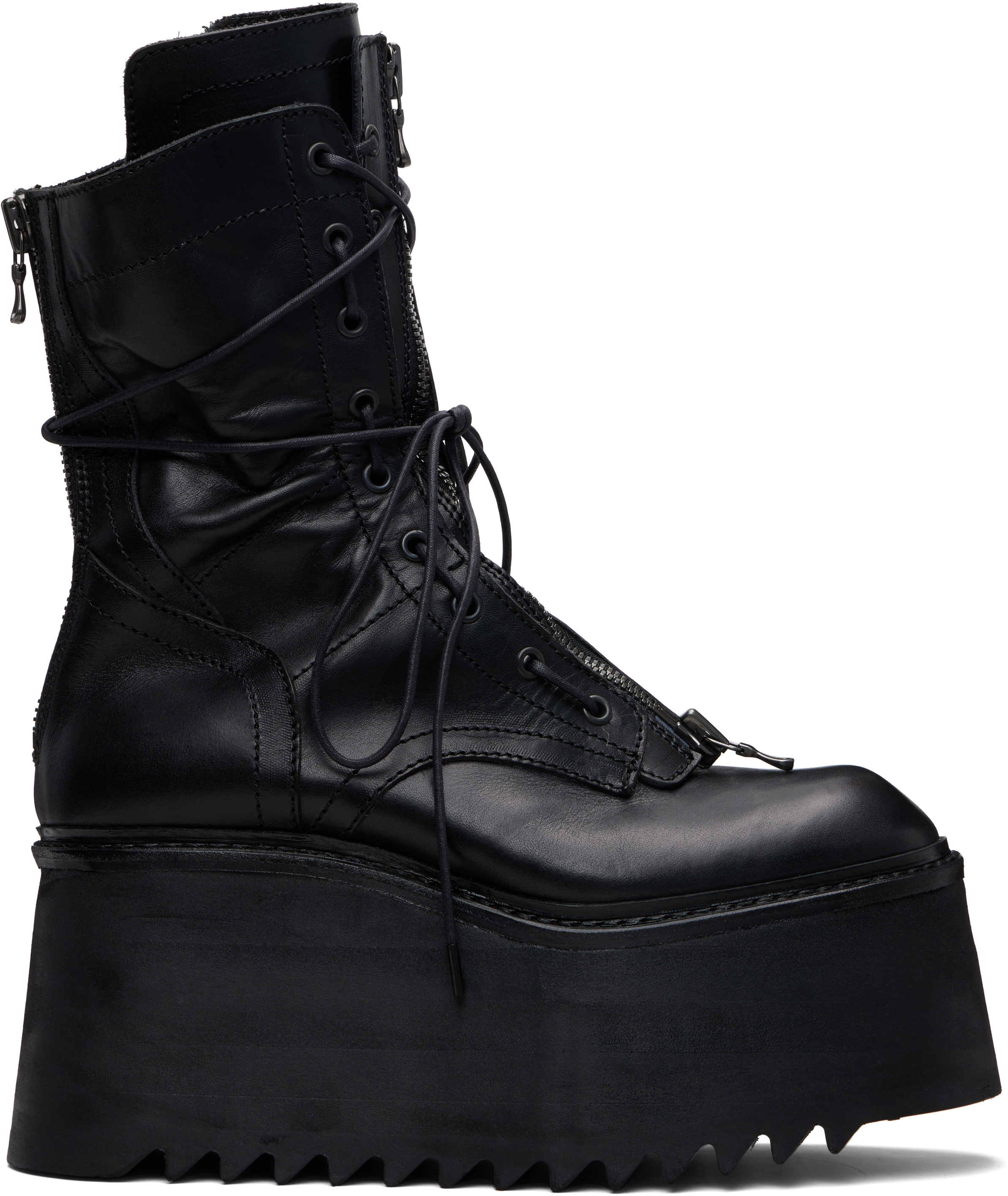 Ankle-high buffed leather boots. · Wraparound lace-up closure · Detachable two-way zip panel at vamp · Zip closure at heel counter · Buffed leather lining · Foam rubber platform midsole · Treaded Vibram® rubber sole · Platform: H3.75 Supplier color: Black