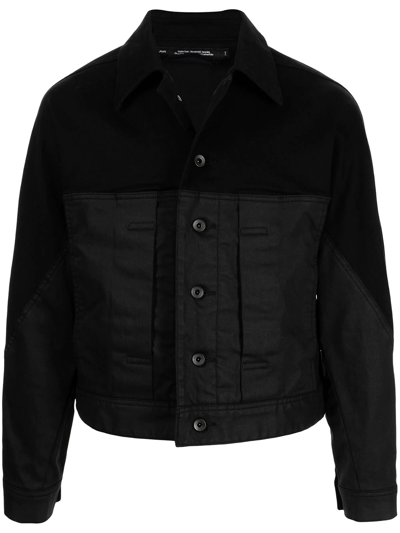 Black cotton-blend panelled cropped jacket from JULIUS featuring panelled design, tonal stitching, classic collar, front button fastening, long sleeves, buttoned cuffs and cropped.