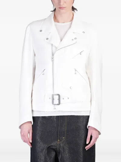 Biker jacket in white polyester, zip closure, biker style, long sleeves, zip pockets, belt waist, sequins, silver hardware, 100% polyester, Made in Japan, Model is 180 cm and wear a size S