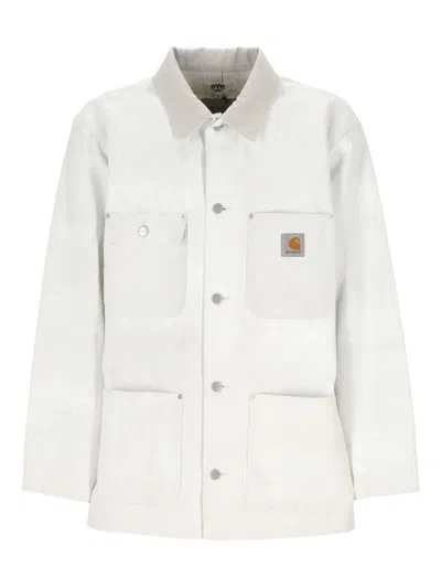 The Clapton jacket, a collaboration between Junya Watanabe and Carhartt, embodies contemporary street style with a sophisticated touch. Made from premium coated white cotton, it features a classic collar, a button closure, and a chic ensemble of one chest flap pocket and three flat front pockets. Signature logo label details enhance its appeal, while buttoned cuffs and a straight hem provide a polished finish.- Premium coated white cotton- Classic collar- Button closure- One chest flap pocket- Three flat front pockets- Buttoned cuffs- Straight hem