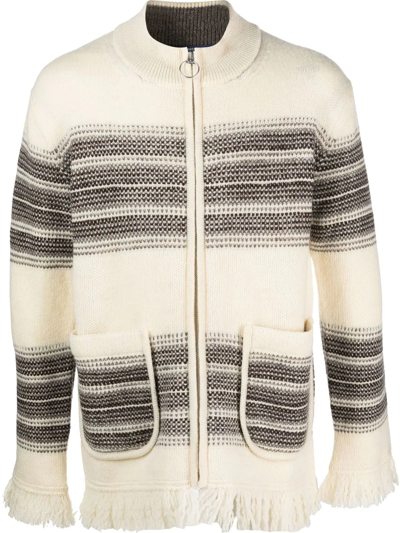 stripe-pattern zip-up cardigan from Junya Watanabe MAN featuring white, coffee brown, knitted construction, frayed detailing, horizontal stripe pattern, mock neck, front zip fastening, long sleeves and two front patch pockets.