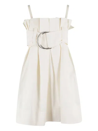 Dress woman in beige cotton, thin straps, side zip closure, belt detail, silver hardware, welt pockets, straight hem, 100% cotton, Made in Bulgaria