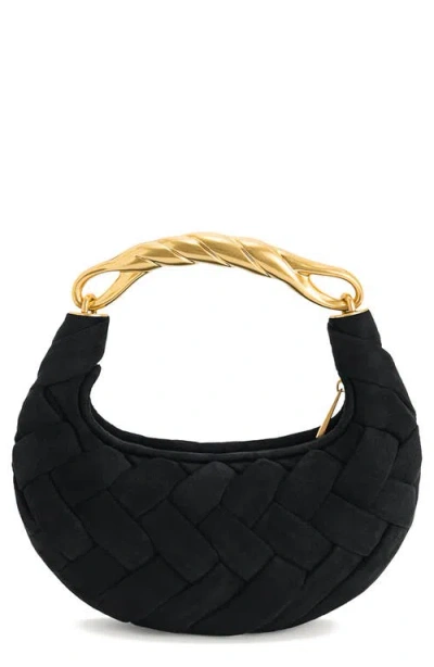 A twisted-metal top handle brings sculptural beauty to this faux-leather clutch featuring an artisanally woven body in a compact, crescent silhouette. 9 1/4"W x 7"H x 3 1/2"D 3 3/4” handle drop; 18 3/4" shoulder strap drop Top zip closure Top carry handle; removable crossbody strap Water repellent Twill lining Textile/synthetic Imported