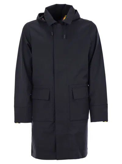 Poirol is a three-quarter length mens jacket, ideal for autumn, that reinterprets the classic rain trench coat in an urban-lifestyle and contemporary key. The straight, structured silhouette of this jacket features a construction with an outer shell in water-repellent technical wool, an inner membrane and a soft jersey lining with heat-taped seams, and is distinguished by its clean lines thanks to the concealed zip with tone-on-tone button and the absence of logos on the front. The model features a detachable and adjustable hood, large flap pockets with concealed buttons, and the K-Way tape detail on the cuff. - Water-repellent, windproof three-layer wool blend fabric - Zip closure - Pockets with concealed buttons - Detachable and adjustable hood - Taped seams - Regular fit - Logo inserted in sleeve bottom DESIGNER ID: K51368W AR0 Composition: 50% Wool, 38% Polyester, 8% Viscose, 4% Elastane