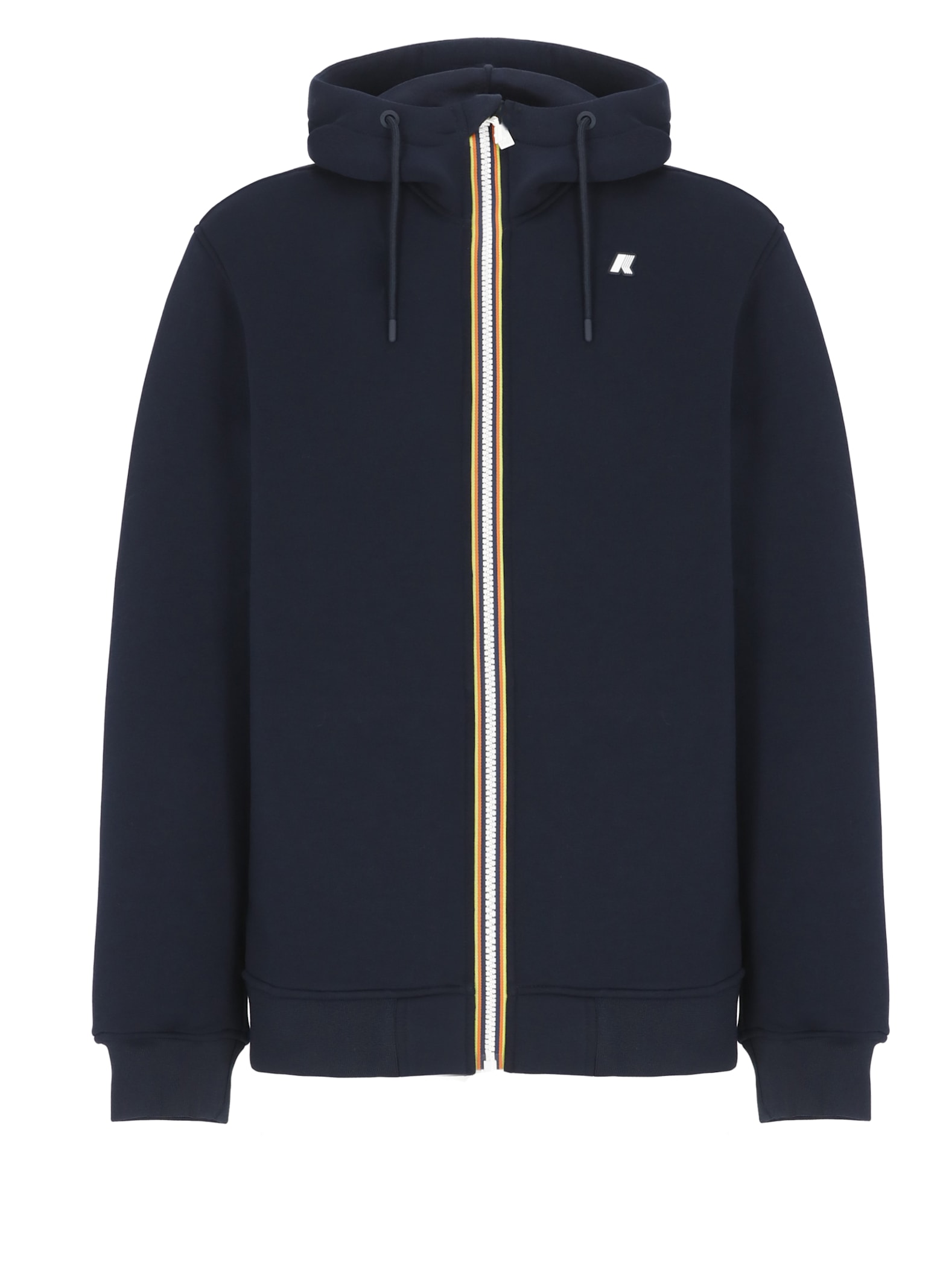 - Dark blue K-Way jacket for man - Hood - Long sleeves - Two side slit pockets - Front zip fastening - Front contrasting color logoed patch Composition: 79% Polyester, 12% Viscose, 9% Elastane