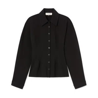 Agatha Shirt Jacket in Black, Size 4: Done in a heavyweight stretch-crepe, this button-up has a nipped-in waist and triple seams on either side of the placket that give the bodice a structured, sculptural shape. The pointed collar and buttoned cuffs hint at classic menswear, but the rounded sleeves keep the silhouette feminine. Pair it with the Damian Trouser for a modern take on suiting, or dress it down a bit with denim.70% viscose, 26% nylon, 4% elastane Made in USA.
