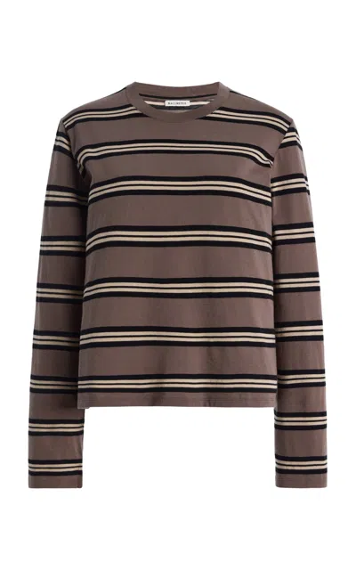 The New York-based brand revises hard-working wardrobe essentials to create elevated pieces for the modern; empowered woman.The perfect long sleeve t-shirt with a relaxed boxy fit and subtle cropped length in custom drawn stripe. Roomy sleeves. Slight taper at waist. Unisex. Shifted side seams give a tailored look. Solid binding at neckline. Designed to tuck perfectly into trousers or denim.