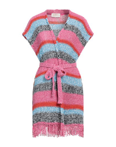 knitted, lightweight knit, fringes, multicolor pattern, deep neckline, short sleeves, no pockets , Color: Fuchsia , Size: S