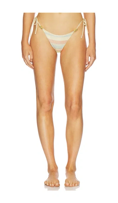 Kapri Beverly Bikini Bottom in Yellow, Baby Blue. - size XXS (also in L, M, S, XL, XS) Kapri Beverly Bikini Bottom in Yellow, Baby Blue. - size XXS (also in L, M, S, XL, XS) 75% rayon 25% polyester. Made in China. Hand wash. Side-tie closures. Item not sold as set. Lightweight ribbed double jersey textile with shiny finish. Gold-tone beads at straps. KPRI-WX2. KKC5-SWB01.