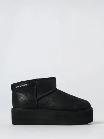 Thermo Lo Pull-On Boot in black. Ankle boot by Karl Lagerfeld in suede with a glitter finish and internal thermal lining. Featuring a platform sole with logo on the collar, slip-on design, glitter finish, platform sole, internal thermal lining, printed logo on the side, and a pull tab on the back.