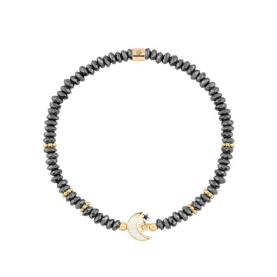 Like the tides, we are all guided by the serene energy of the Moon. Our designers brought together the cosmic power of moonlight and the earthy, grounding vibrations of Hematite stones in this calming bracelet, which will help guide you toward mindfulness and inner peace. Stay grounded in positivity with the aid of authentic healing stones. 4 mm Hematite Stones White Enamel 18K Gold Plated Brass Care Guidelines Avoid contact with water, chemicals and perfumes as these may cause tarnishing and discoloration. Clean gently with a dry, non-abrasive cloth. Natural Variation Disclaimer Genuine stones naturally vary in color and size. Each piece is unique and may differ slightly from the product pictured.