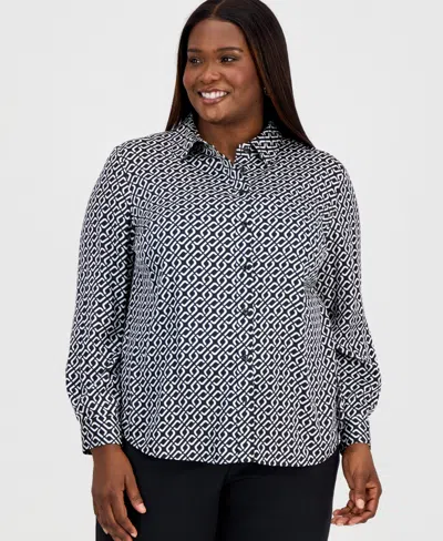Kasper's plus size long-sleeve button-front shirt is made from printed heavy satin fabric featuring an intricate geometric pattern in black and white, making it ideal for layering with suiting separates.