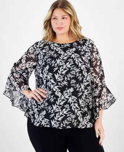 KASPER Plus Size Printed Crewneck Ruffle-sleeve Blouse In Blk,vanilla Ice Mlt