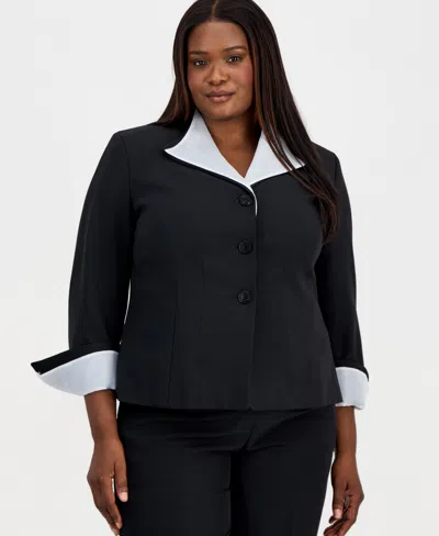 Kasper's plus size blazer features a structured silhouette, vertical seam detailing and a three button closure for a polished, professional look.