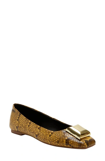 A gleaming metal ornament enriches the instep of a stylish flat fashioned with a square toe for contemporary appeal.
