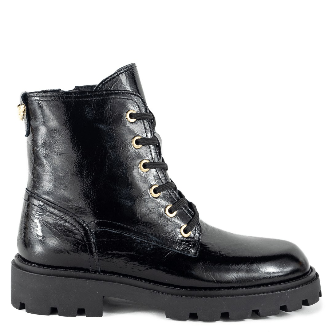These lace up ankle boots are crafted in smooth, black, patent leather for a unique and polished look. Cut high on the ankle they feature a round toe, low heel and lace up front with a side zip for extra ease of wear. The chunky sole adds a rock chic vibe to Lucido's classic biker silhouette. A small gold bee adorns the upper heel of the shoe for an eye catching finishing touch. Uppers - 100% Leather Lining - Leather and Textile Sole - Rubber Protect and nourish the leather with a neutral cream and a soft cloth. Wipe dirt off with a damp cloth.