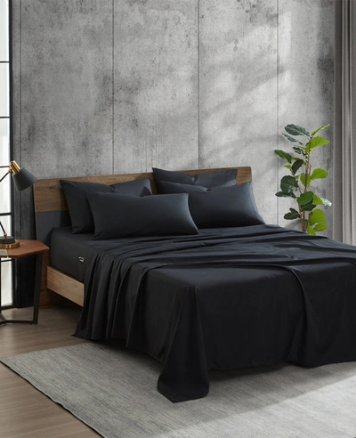 IT'S ALL IN THE . Details: Sheet set 5-Piece sheet set includes one twin flat sheet, one twin fitted sheet, and three pillowcases Fitted sheet features branded all-around elastic and cell phone pockets on each side Super-soft to the touch Features a topical cooling finish for a comfortable night's sleep Wrinkle-resistant Twin flat sheet: 66" W x 96" L, Twin fitted sheet: 39" W x 75" L + 16" deep pocket, standard pillowcase(s); 30" W x 20" L Full flat sheet: 81" W x 96" L, full fitted sheet: 54" W x 75" L + 16" dee pocket, standard pillowcase(s); 30"Wx20"L Queen flat sheet: 94" W x 102" L, queen fitted sheet: 60" W x 80" L + 16" deep pocket, standard pillowcase(s); 30" W x 20" L King flat sheet: 112" W x 102" L, king fitted sheet: 78" W x 80" L + 16" deep pocket, king pillowcase(s); 40" W x 20" L Standard 100 By OEKO-TEX® Certified 100% recycled polyester Machine wash Imported | Kenneth Cole | Solution Solid Sheet Set in Black, Size: Full